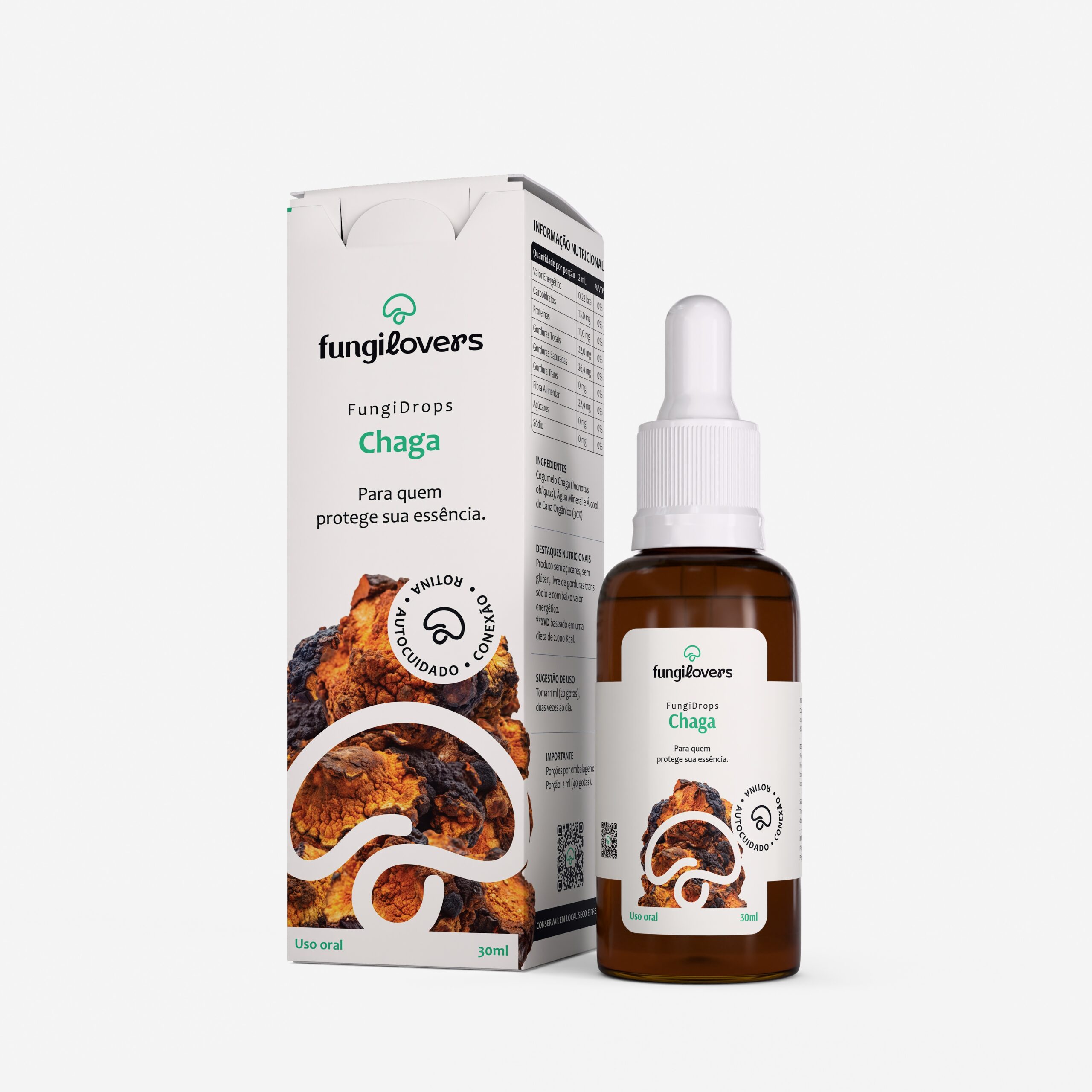 Coletado de forma responsável por comunidades locais, o Chaga é extrato sem comprometer a árvore hospedeira, respeitando seu ciclo natural.